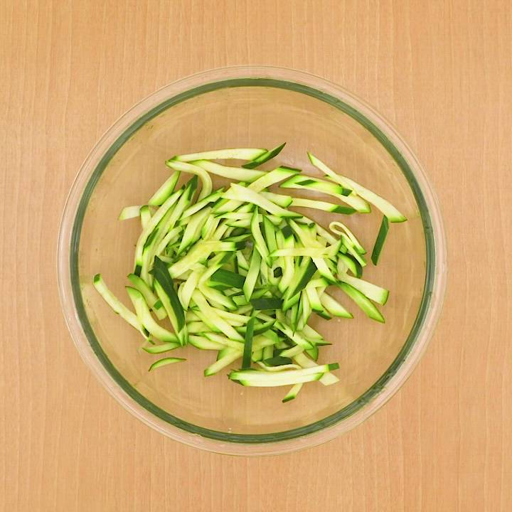 耐熱容器にズッキーニを入れてふんわりとラップをし、600Wのレンジで1分30秒加熱し、粗熱をとって水気を切る。