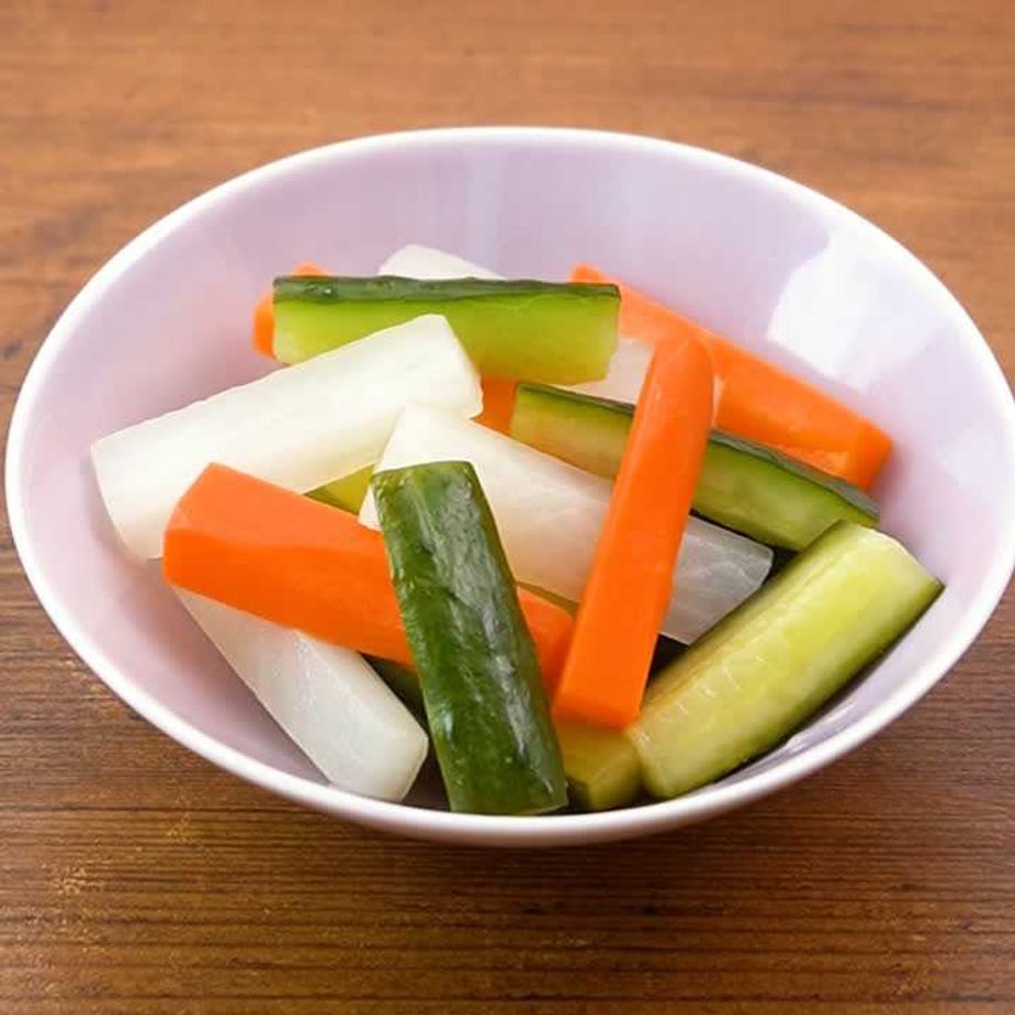 きゅうりはへたを切り落とし、5cm幅に切って縦十字に切る。にんじんは皮をむき、1cm角の棒状にする。大根は厚めに皮をむき、1cm角の棒状にする。