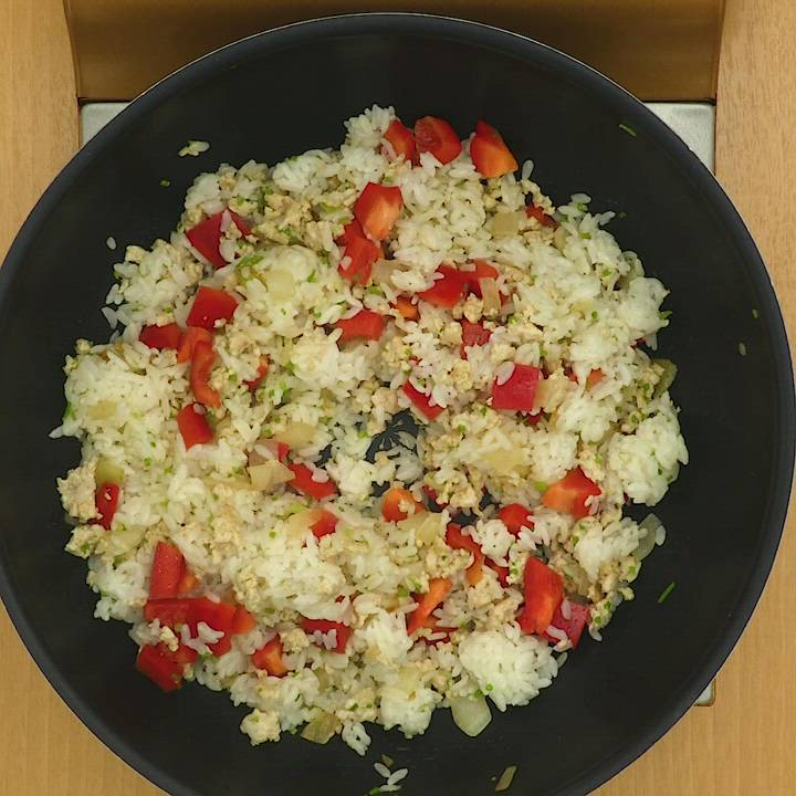 フライパンにサラダ油を入れて中火で熱し、玉ねぎを入れてしんなりするまで炒める。鶏ひき肉、パクチーの茎を加えて色が変わるまで炒め、酒を加えて水分がとぶまで炒める。ごはん、パプリカを加えて全体を炒め合わせる。