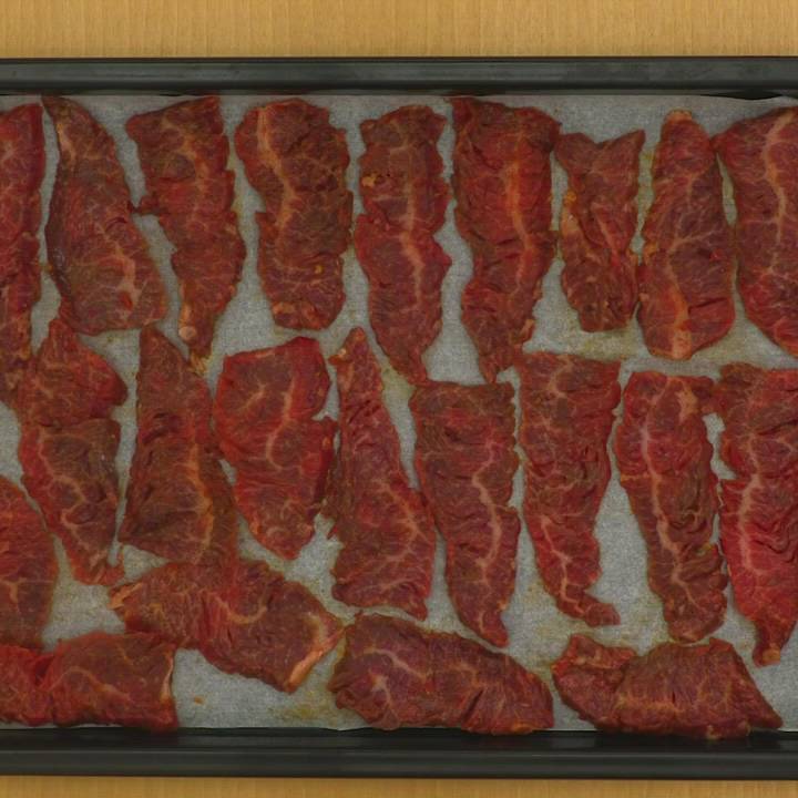120℃に予熱したオーブンで30分ほど焼き、水気をキッチンペーパーでふきとる。裏に返し、さらに30分ほど肉の表面が乾燥するまで焼く。