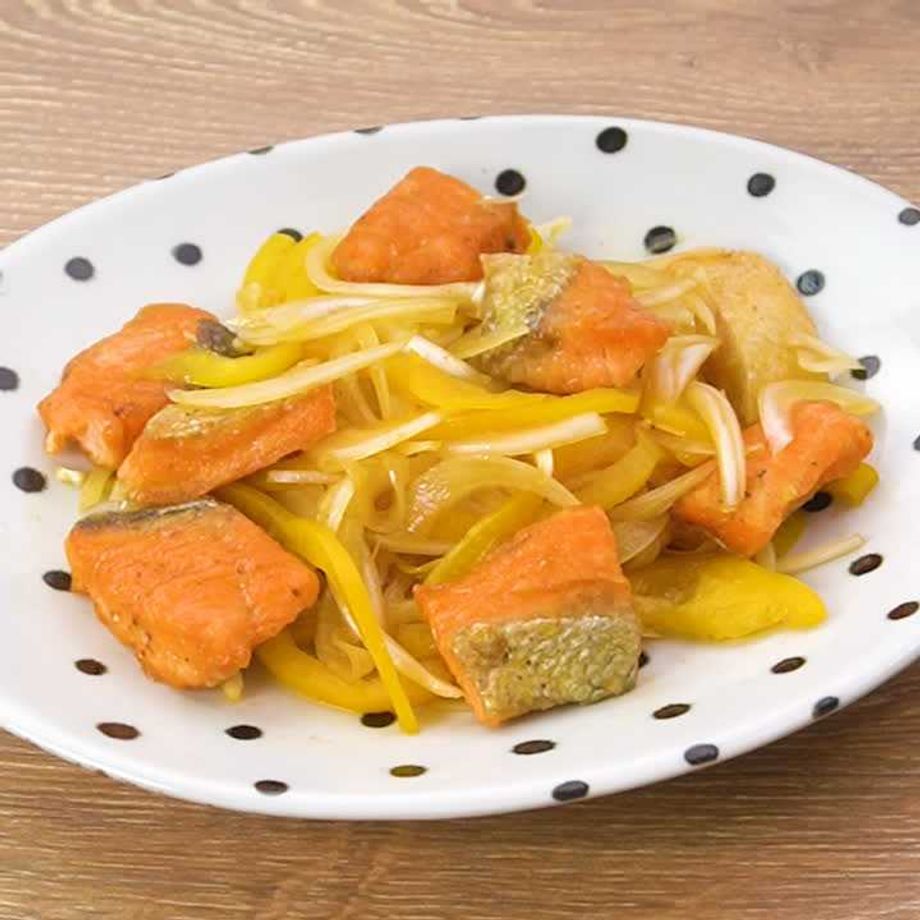 鮭は一口大に切り、塩こしょうをふり、片栗粉をまぶす。