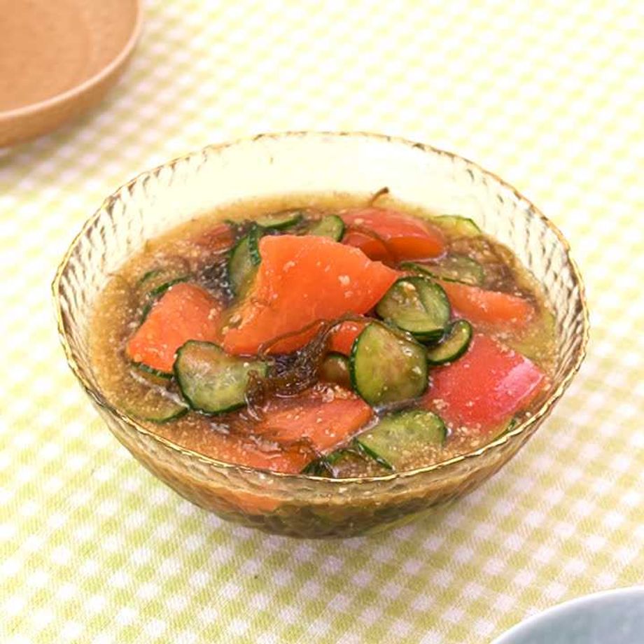 もずく、トマト、きゅうりが具材のお手軽副菜を作ります♪きゅうりは塩もみをしてしんなりとさせることで、調味料との味なじみがよくなります。トマトとポン酢の酸味と、香ばしいごまの風味でつるんと食べられる一品です。