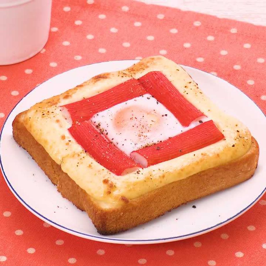 天板に食パンをのせ、食パンのふちにマヨネーズをどてを作るようにしぼり、卵を真ん中に割り入れる。かにかまぼこをどてにそって四角になるようにのせる。