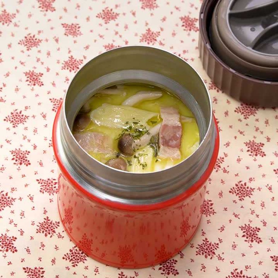 ベーコンときのこの旨味がしみ出たスープがおいしい♪ほっと温まるスープジャーレシピをご紹介します。火を使わずにレンジで作るので、忙しい朝でも簡単に作れるのが嬉しいポイントです!こちらのレシピはお使いのスープジャーの取扱説明書を必ずご確認ください。