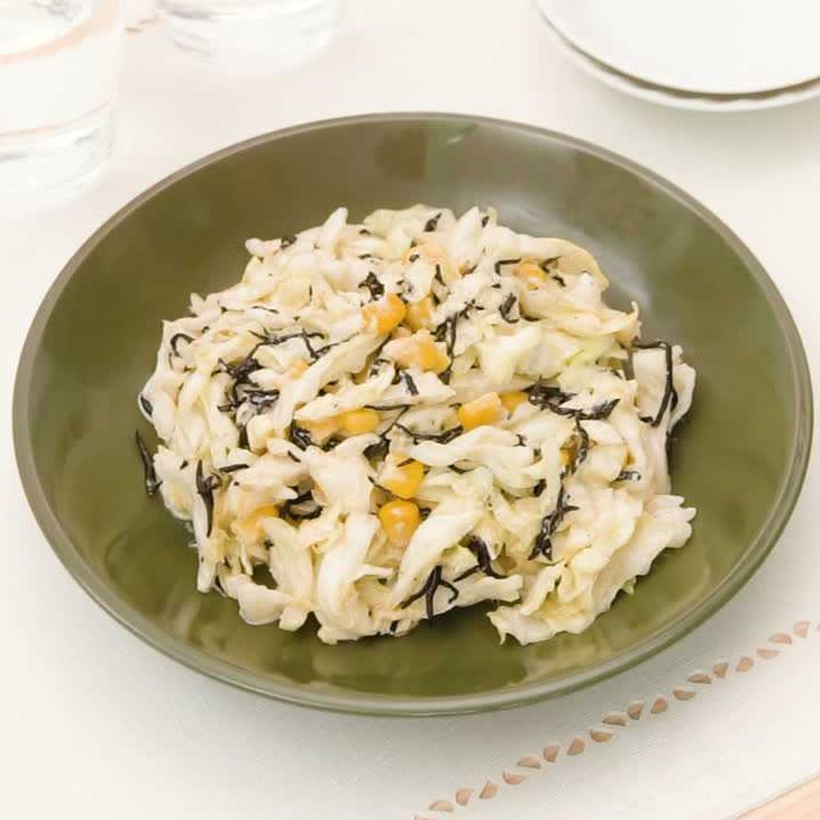 キャベツとひじき、コーン缶の副菜をご紹介します。キャベツは千切りにして塩もみにすることで、シャキッとした食感はそのまま、しんなりとさせて食べやすく、味なじみを良くすることができます。マヨネーズのコクとめんつゆの風味が合わさってパクパクと食べられるおいしさです。