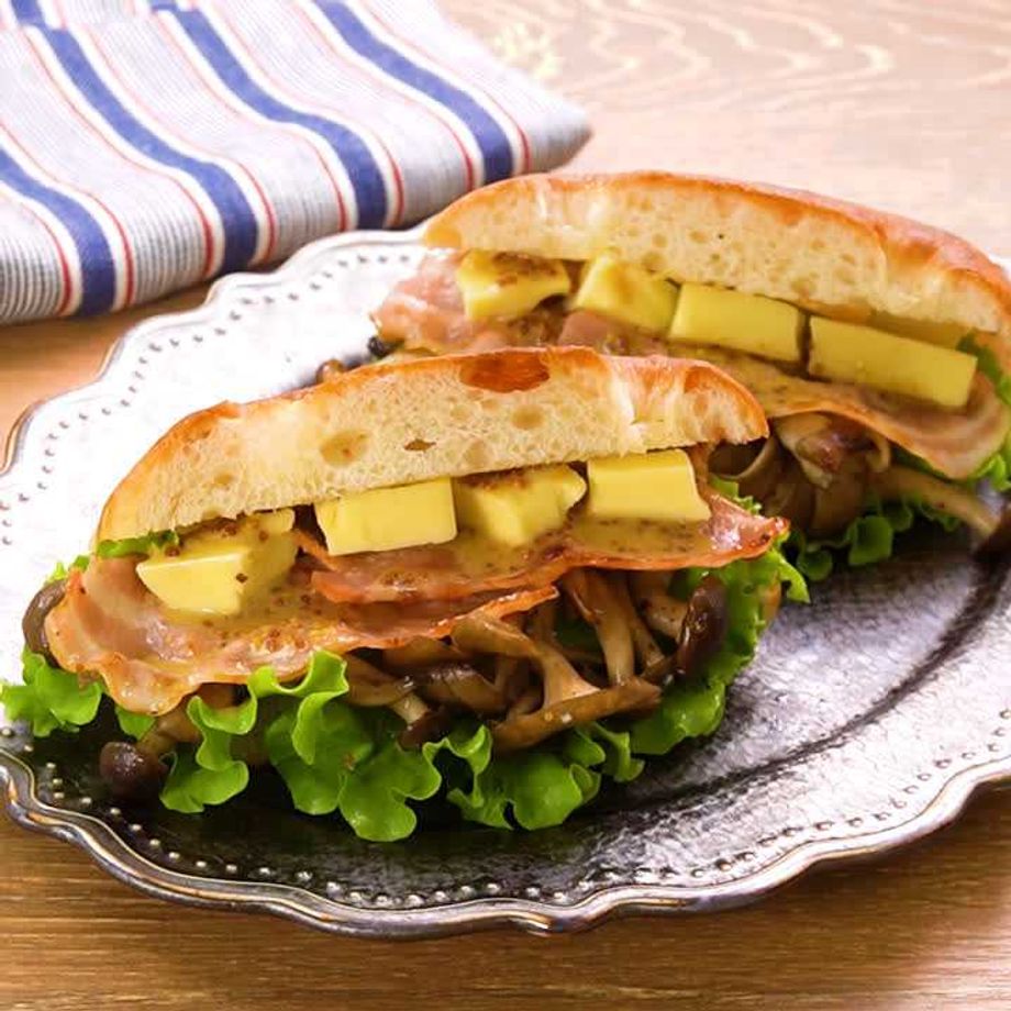 市販のフォカッチャに、こんがりと焼いて香りを出したきのことベーコンをサンドしました♪混ぜるだけのハニーマスタードソースがアクセントに!まろやかな甘さに、フォカッチャやベーコンの塩気が相性バツグンのレシピです。朝食やランチにぜひ作ってみてください!