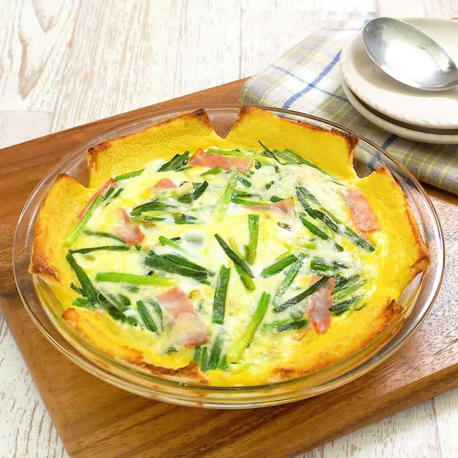 タルト生地は食パンで代用して、簡単なのに豪華な見た目♪ ふわふわのキッシュにさっと炒めた大分味一ねぎを加えて香りと甘み、シャキッと食感をプラス♪ トースターで簡単にできて忙しい時にもぴったり! おもてなし料理にもおすすめの一品です♪