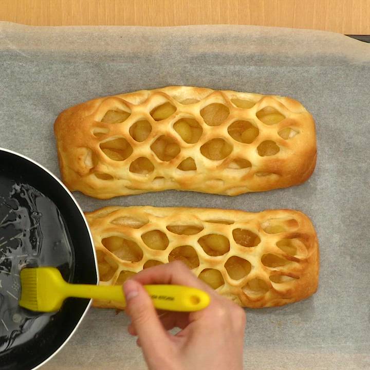 生地を20cm×30cmになるようにめん棒でのばす。生地を縦長に半分に切り、生地の半分に強力粉(分量外:適量)をふり、残りの半分にりんごの甘煮をのせて広げる。強力粉をふった半分の生地にメッシュローラーで切り込みを入れる。切り込みを入れた生地をかぶせるように折りたたみ、端をしっかりと閉じる。同様に計2個作る。天板にクッキングシートを敷き、生地をのせる。ラップをかぶせ、暖かい場所でひとまわり大きくなるまで30分ほどおく(二次発酵)。