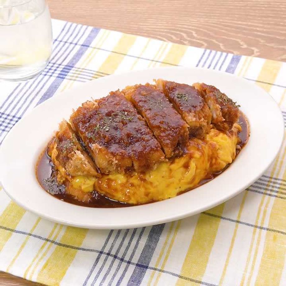 初めて作りました。残った生パン粉付きとんかつを使いました。それを揚げて使いました。半熟卵のままライスにのせることが出来ず焼いた面を上にしてしまい半熟卵に返す途中オムライスが破れちゃったりしましたが上手に出来ました。メグ
