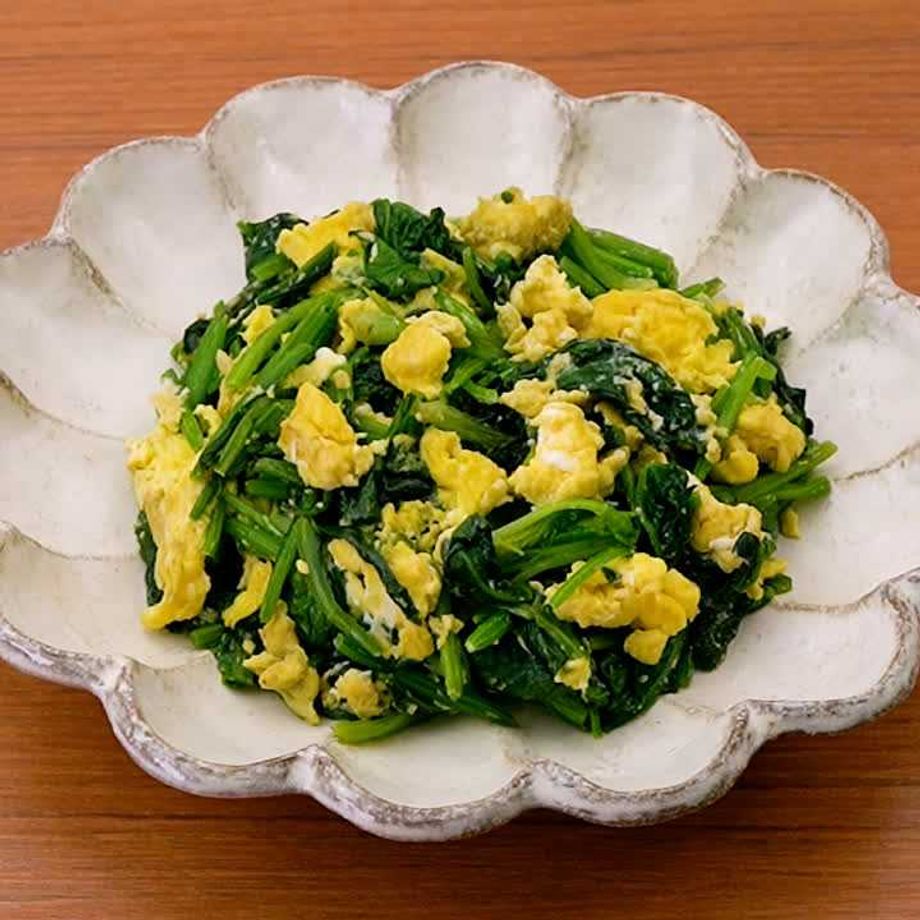 ほうれん草を端に寄せ、卵を流し入れる。半熟状になるまで混ぜ、全体を炒め合わせる。