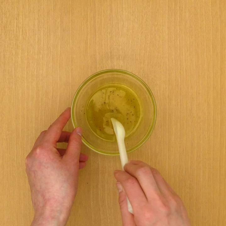 ボウルに砂糖、塩、こしょう、酢を入れてよく混ぜる。オリーブオイルを少しずつ加えながら都度混ぜる。