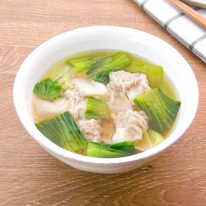 別の鍋に★を入れて中火で熱し、煮立ったらチンゲン菜の茎を加えてやわらかくなるまでふたをして3〜5分ほど弱火で煮る。チンゲン菜の葉、ワンタンを加えてさっと煮る。