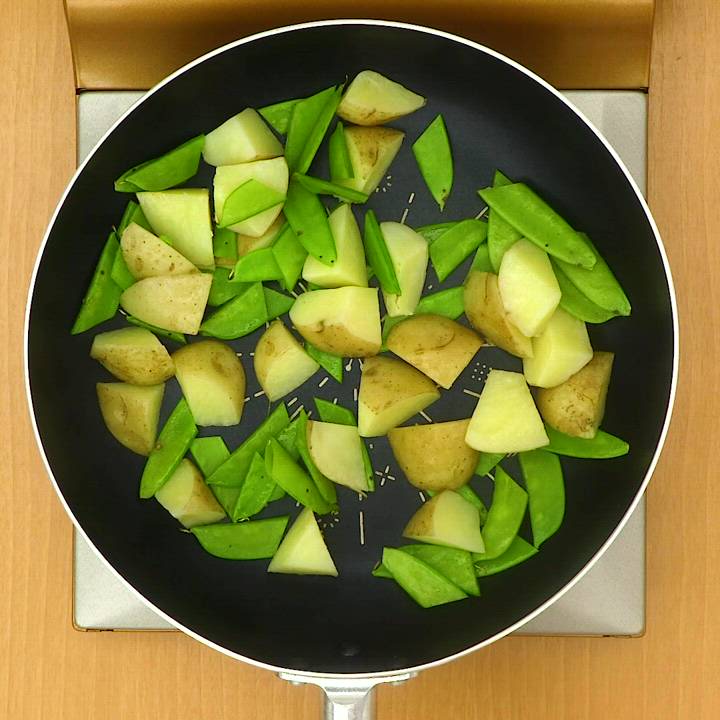 フライパンにサラダ油を入れて中火で熱し、新じゃがいもを入れて転がしながら焼き色がつくまで焼く。絹さやを加えてさっと炒める。