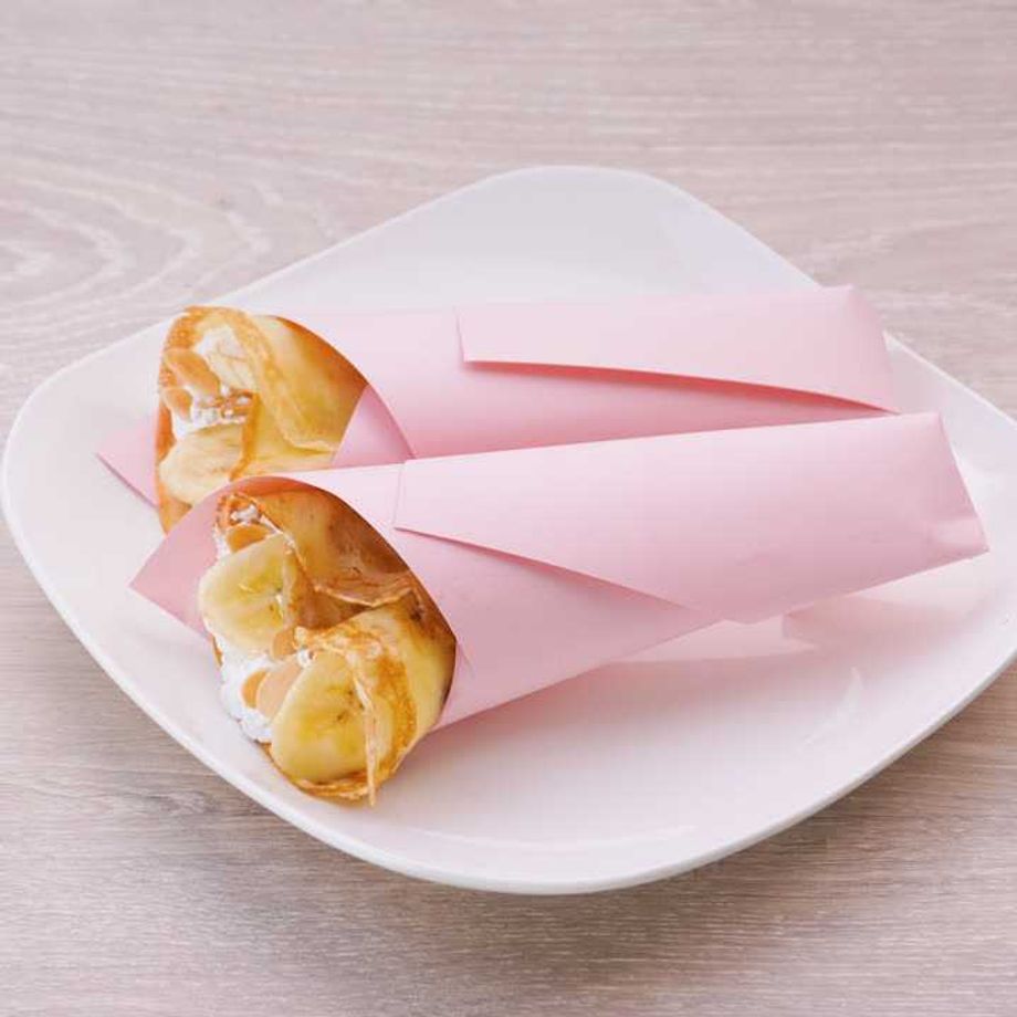 お家で手作りしたクレープを、お店みたいにきれいに巻く方法をご紹介します。今回は、バナナとホイップクリームを具材にしています。四角の紙を最後に重ねることでより食べやすい形状になり、テンションも上がる見た目に♪お好みのイラストや柄の紙を使っておしゃれに仕上げましょう。