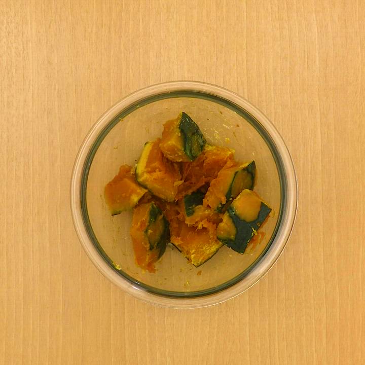かぼちゃは種とわたを取り除き、一口大に切る。皮のかたい部分はそぐようにところどころ切り落とす。耐熱容器に入れ、水(分量外:大さじ1)を加えてふんわりとラップをし、600Wのレンジで5分ほどやわらかくなるまで加熱する。水気を切って耐熱容器に戻し入れ、塩を加えて混ぜる。