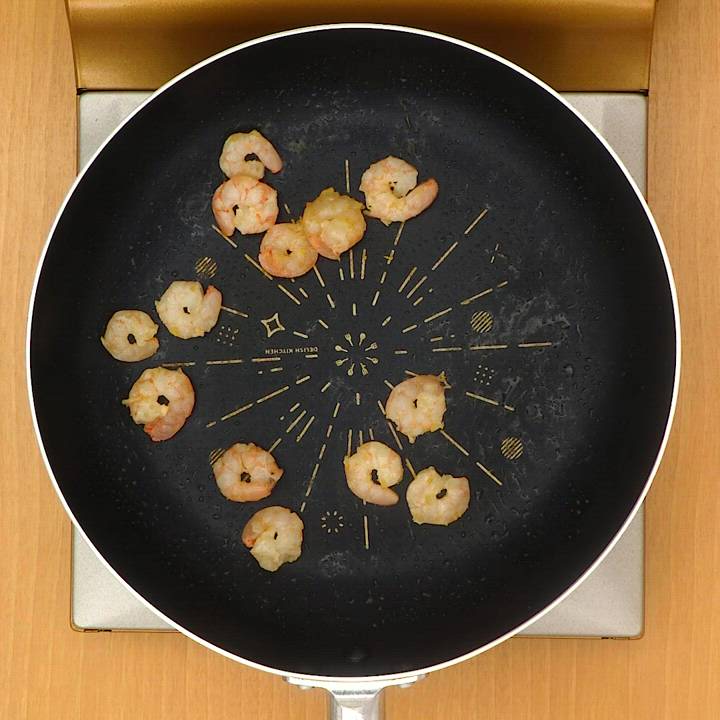 フライパンにオリーブオイルを入れて中火で熱し、むきえびを入れて色が変わるまで1〜2分炒める。