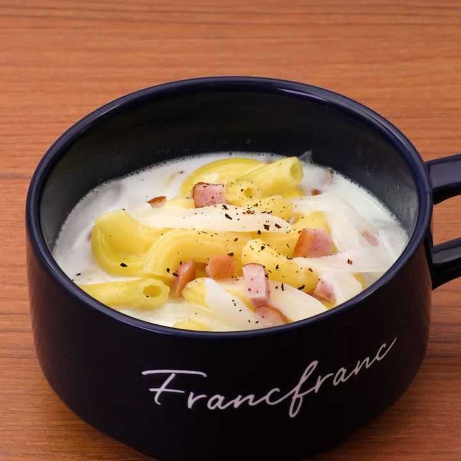 耐熱マグカップにマカロニ、ソーセージ、玉ねぎ、☆を入れて混ぜ、ラップをせずに600Wのレンジで2〜3分ほど加熱する。取り出して混ぜ、ラップをしてマカロニがやわらかくなるまで2分ほどおく。