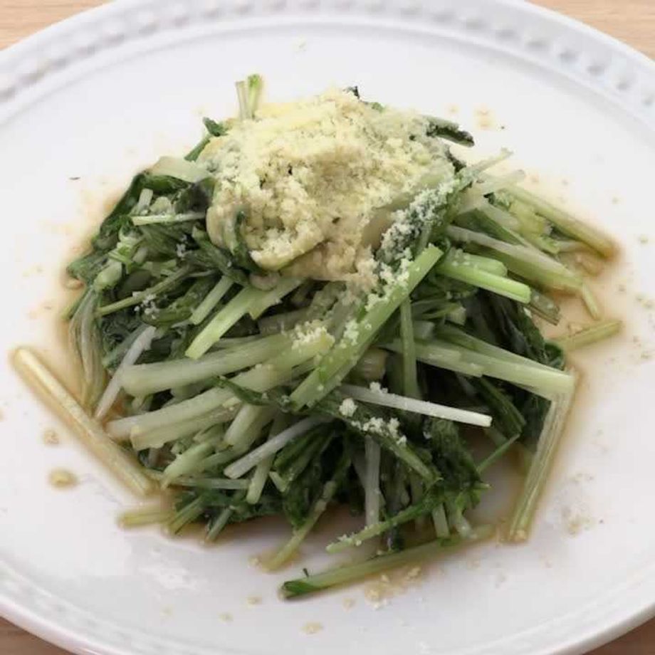 フライパンにサラダ油を入れて熱し、水菜を広げ入れる。ふたをして中火で30秒ほど蒸し焼きにする。ふたを取り、ポン酢しょうゆ、こしょうを加えてしんなりするまで1〜2分炒める。粉チーズをふる。