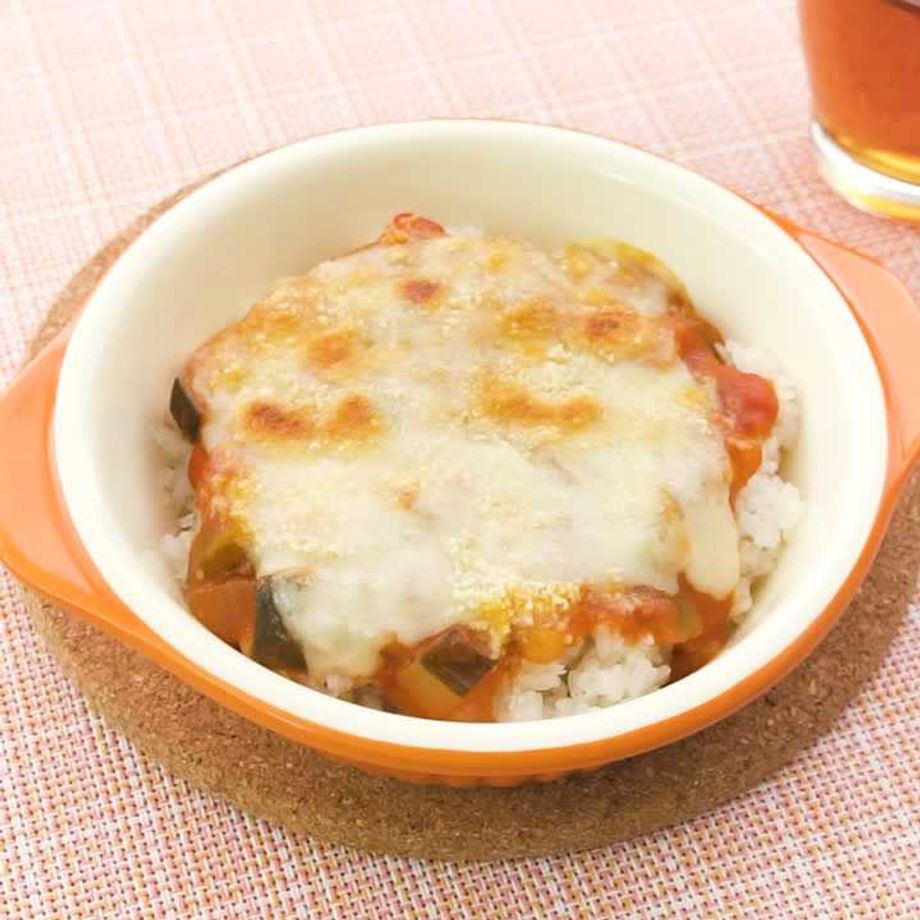 耐熱容器にバターライスを入れて平らにならし、ラタトゥイユをかける。とろけるスライスチーズをのせ、粉チーズをふる。