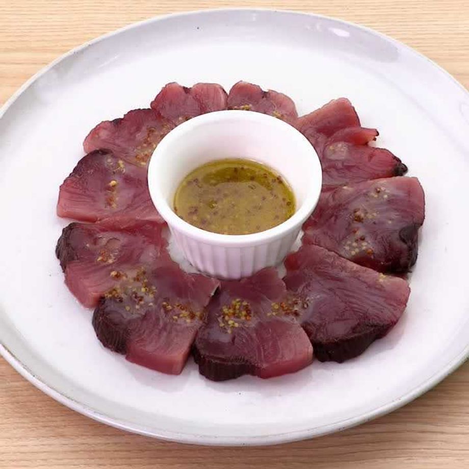 さっぱりカルパッチョに飽きたらハニーマスタードソースのまったり濃厚味で!お酒にもよく合うおもてなしレシピなので、ぜひお試しください♪