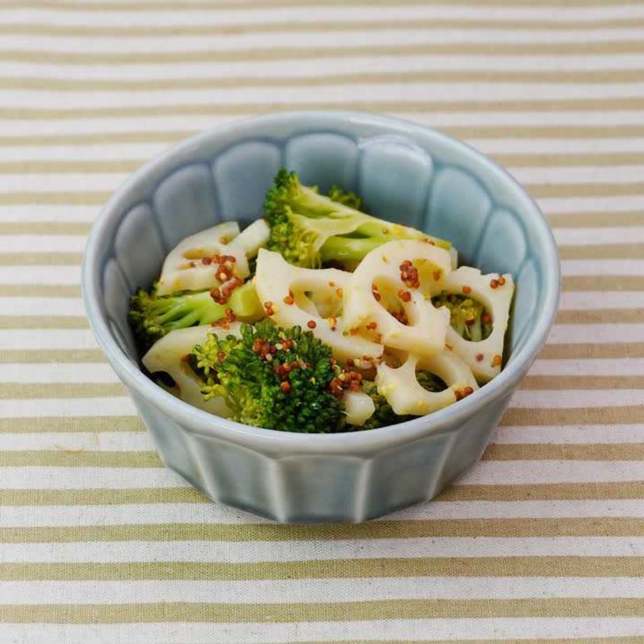 れんこんのシャキシャキ食感が楽しい副菜レシピです。粒マスタードとレモン汁の酸味でさっぱりと召し上がます♪ 【本レシピはプレミアム献立用レシピです】プレミアム献立は管理栄養士が栄養バランスや塩分量を計算して、食のプロが献立を作成しています。主菜、副菜、汁物が揃ったプレミアム献立で本レシピを作るとより美味しく食べることができます。ぜひプレミアム献立で献立内容をチェックしてみてください。