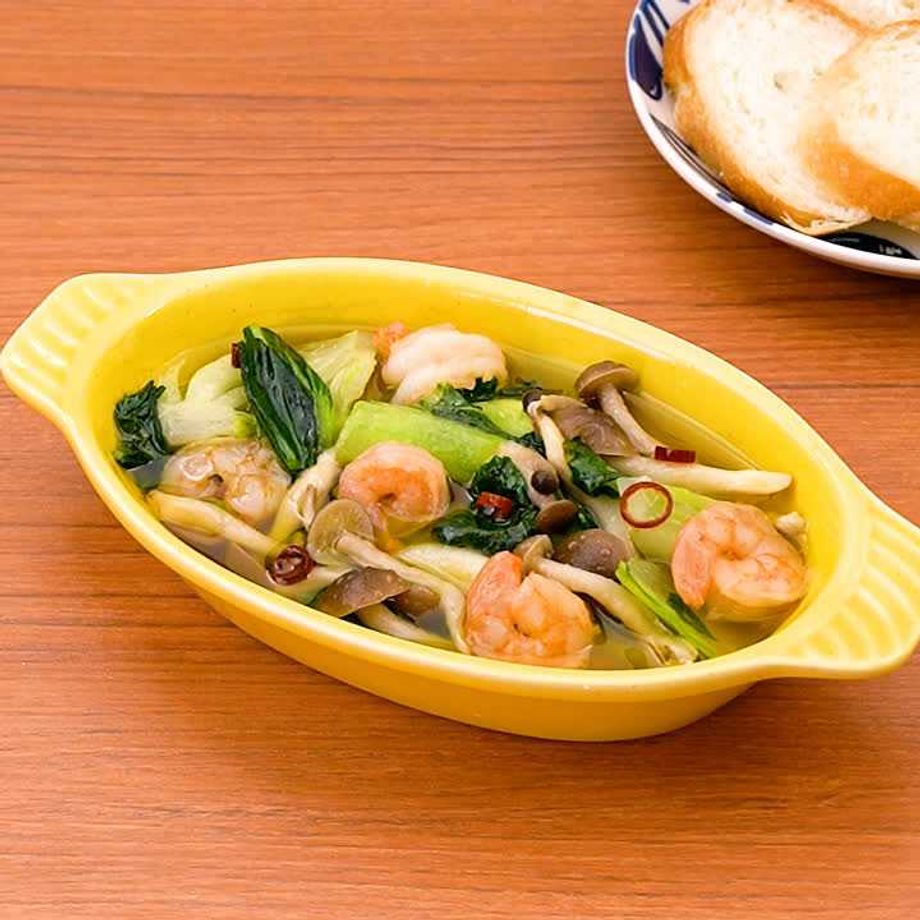 しめじとえびとチンゲン菜を使った簡単アヒージョをご紹介。ぜひバゲットと一緒にお召し上がりください。すぐに仕上がるのでもう一品欲しい時に簡単に作れます♪ 【減塩対策対応レシピ】※減塩対策ついてはQ&Aをご参照ください。