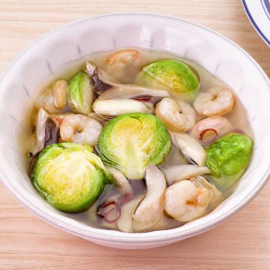 鍋にオリーブオイル、にんにく、唐辛子、塩を入れて香りが立つまで弱火で加熱する。むきえび、エリンギを加えてむきえびの色が変わるまで中火で煮る。芽キャベツを加えてしんなりするまでさっと煮る。