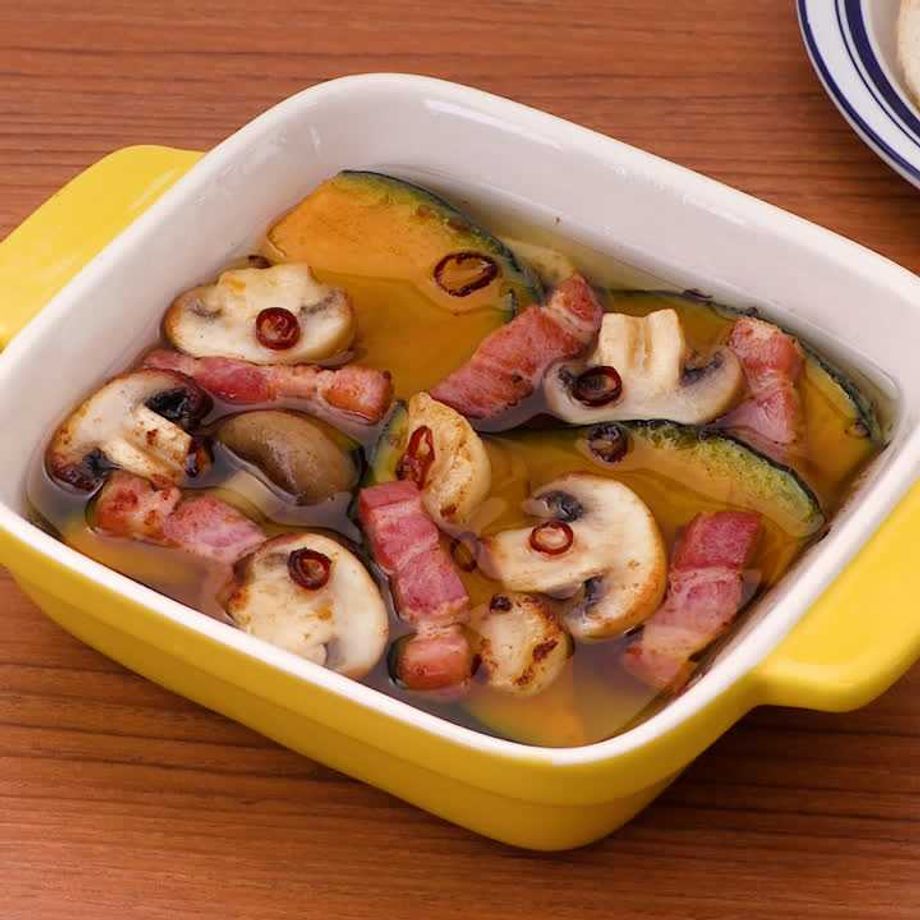 鍋にオリーブオイル、にんにく、唐辛子、塩を入れて香りが立つまで弱火で加熱する。ベーコン、マッシュルーム、かぼちゃを加え、かぼちゃがやわらかくなるまで中火で3〜5分煮る。