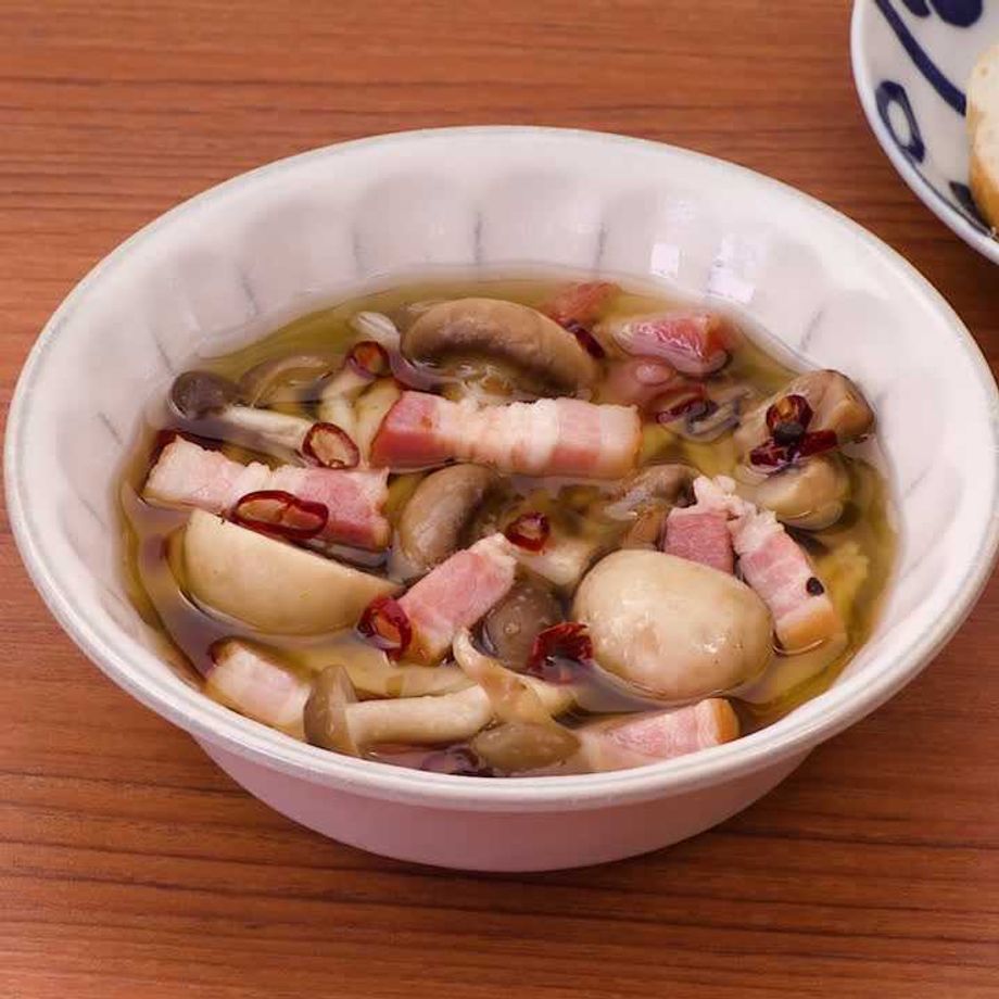 鍋にオリーブオイル、にんにく、唐辛子、塩を入れて香りが立つまで弱火で加熱する。ベーコン、マッシュルーム、しめじを加えて中火で3〜5分煮る。