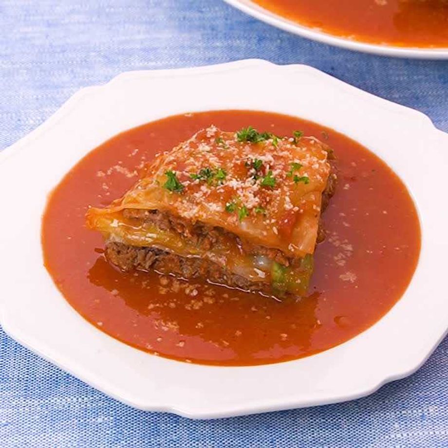手間のかかるロールキャベツを、包まずに重ねてミルフィーユ状にした簡単ロールキャベツです。今回は市販のトマトソースを使い、より簡単に仕上げています♪平日の忙しい日の夕食におすすめ!