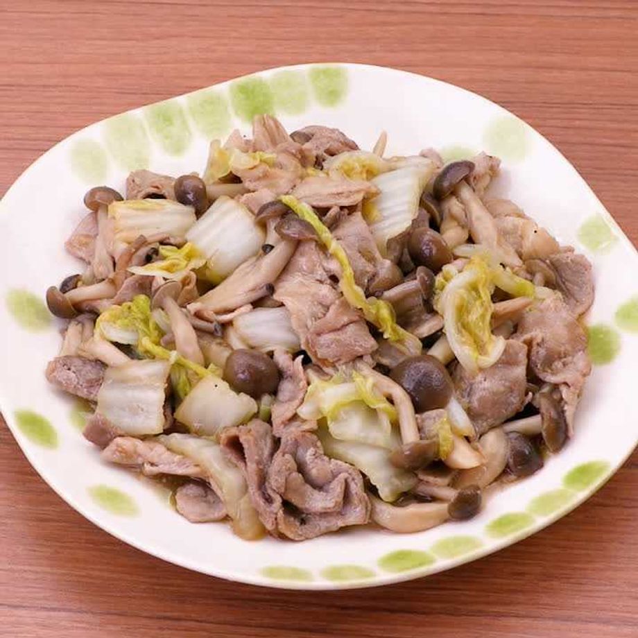 フライパンにサラダ油を入れて熱し、豚肉、しめじ、おろしにんにくを入れて肉の色が変わるまで中火で炒める。白菜を加えて全体に油がまわるまで炒める。