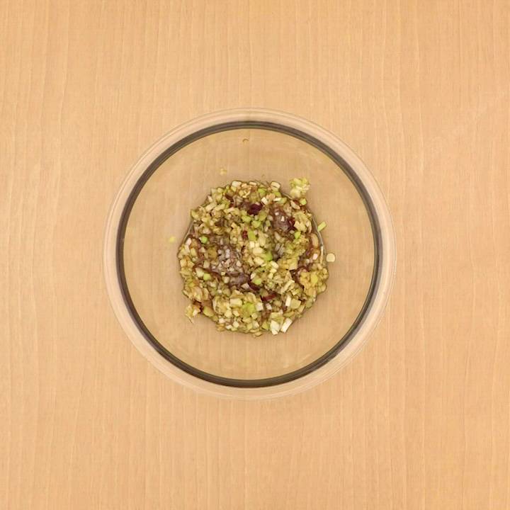 フライパンにサラダ油を入れて熱し、豚肉を入れカリカリになるまで中火で揚げ焼きする。3に加えて混ぜ、5分おく。