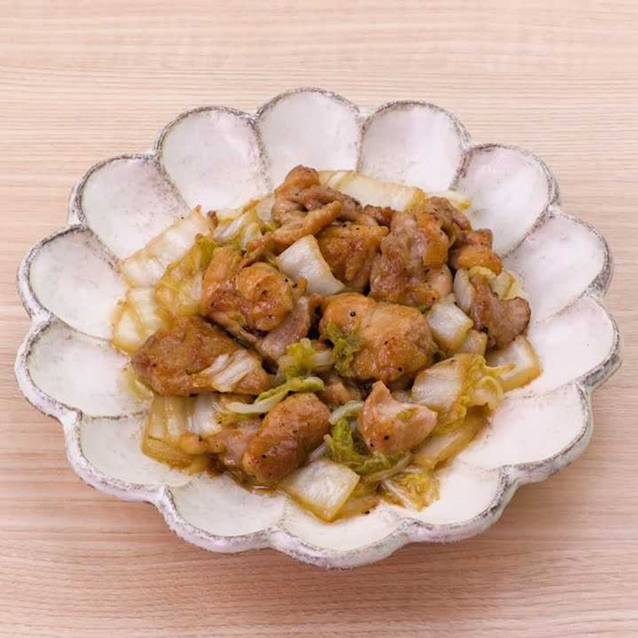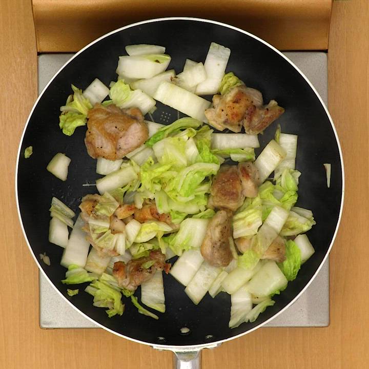 フライパンにサラダ油を入れて中火で熱し、鶏肉の皮目を下にして入れて焼き色がつくまで焼いて裏返す。肉に火が通るまでさらに2〜3分焼く。白菜を加えてしんなりするまで炒める。