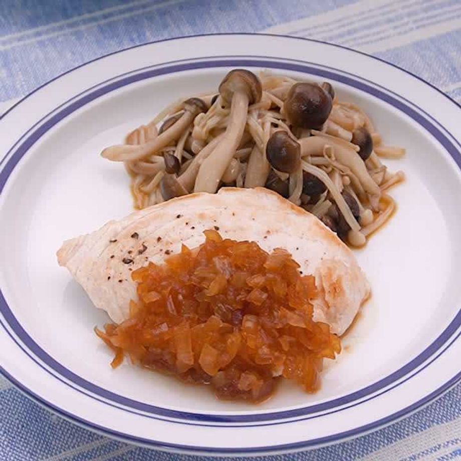 あっさりしたメカジキに、シャキシャキ食感の玉ねぎソースをたっぷりかけました!玉ねぎソースは、お肉にも合う万能ソースです♪【減塩対策対応レシピ】※減塩対策ついてはQ&Aをご参照ください。