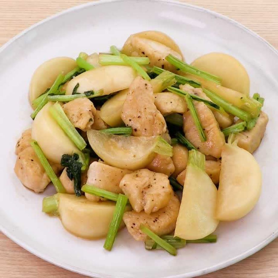 フライパンにサラダ油を入れて中火で熱し、鶏肉を入れて肉に火が通るまで炒める。かぶの白い部分を加えて油が馴染むまで炒め、水(分量外:大さじ1)を加えてふたをして弱火で2〜3分蒸し焼きにする。ふたを取り、水分を飛ばしながら炒め、かぶの葉を加えて手早く炒める。