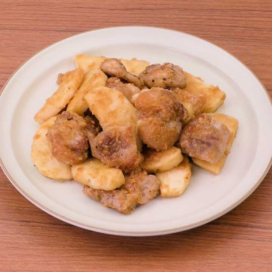 フライパンにサラダ油を入れて中火で熱し、鶏肉の皮目を下にして入れて焼き色がつくまで焼いて裏返す。肉に火が通るまでさらに2〜3分焼く。長芋を加えて火が通るまで炒める。