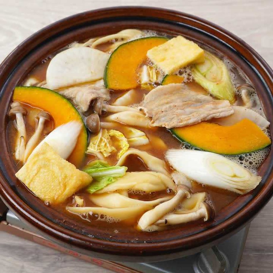 「ほうとう」は山梨県の郷土料理。小麦粉を練った太めの平打ち麺であるほうとうは食べ応え抜群です!打ち粉がついたまま煮込むので、汁にとろみがつき、麺に汁がよく絡みます。味噌がベースのスープで野菜と一緒に煮込み、あつあつの状態でお召し上がりください。体が温まり、寒い日にぴったりな一品です♪