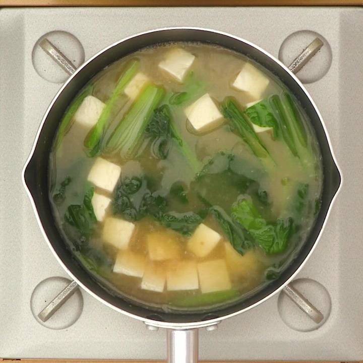 鍋に水、和風顆粒だしを入れて中火で熱し、煮立たせる。豆腐、小松菜を入れてふたをして弱火で3分煮る。火を止めてみそを溶かし入れ、沸騰直前まで中火で加熱する。