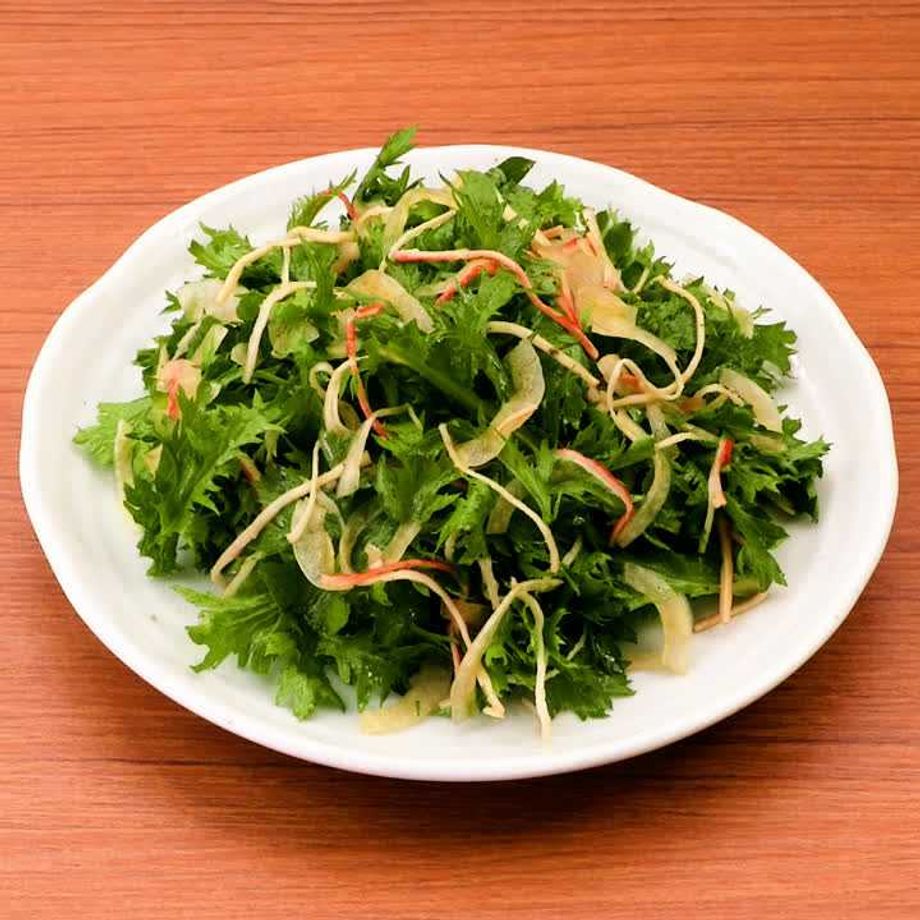 わさび菜のピリッと感がクセになるサラダレシピをご紹介!かにかまぼこで色味をプラスしてお召し上がりください。お手製のドレッシングがよく合います♪