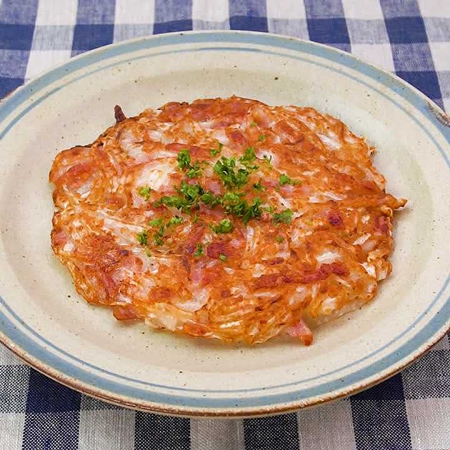 細切りした大根をベーコン、粉チーズとこんがり焼き上げたハッシュドポテト風の一品をご紹介します。大根はジュワッとやわらかく、表面はカリッとした食感がおいしいです。