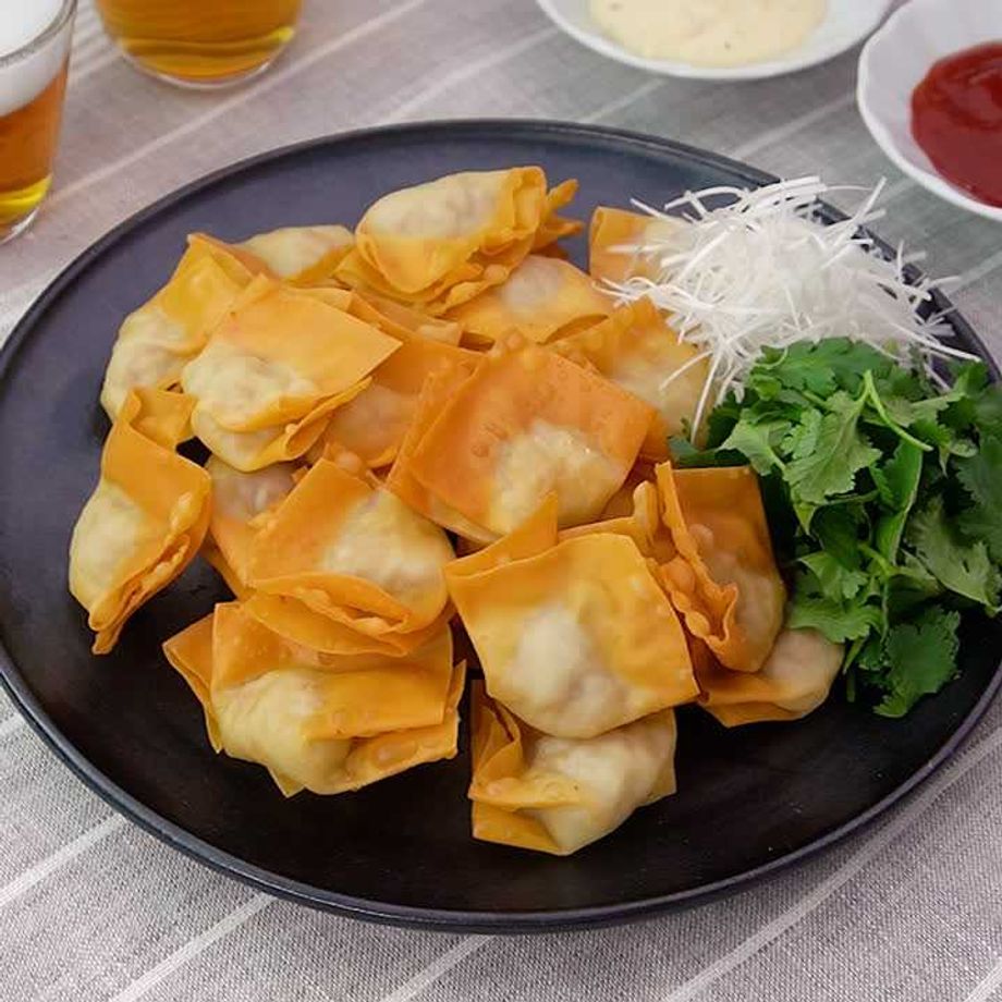 鍋に底から3cm程度のサラダ油を入れて170℃になるまで中火で熱する。ワンタンを入れて肉に火が通り、きつね色になるまで2〜3分揚げる(揚げワンタン)。