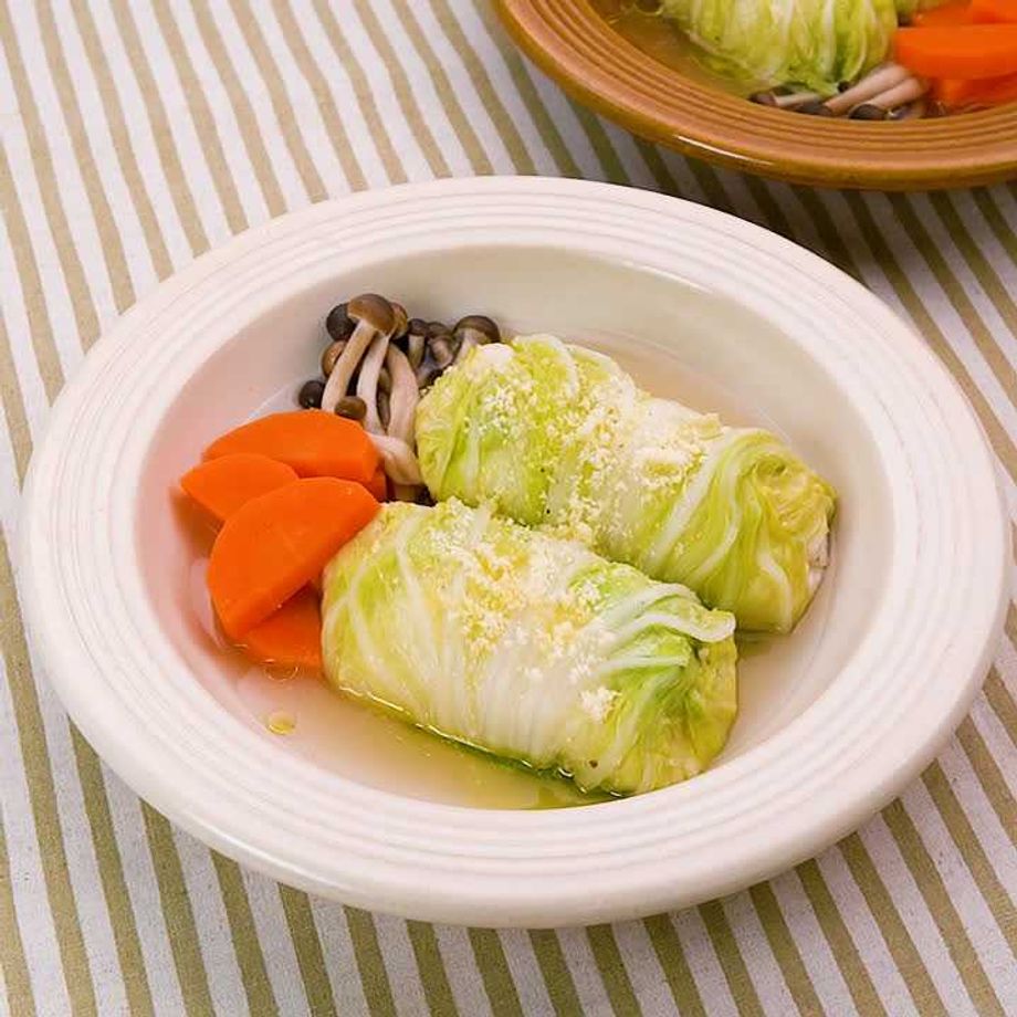 深さのある耐熱皿に★を入れて混ぜる。ロール白菜の巻き終わりを下にして加え、あいたところににんじん、しめじを加える。ふんわりとラップをし、600Wのレンジで肉に火が通るまで8〜9分加熱する。具材にスープをかけて粗熱をとる。つまようじを取り除く。