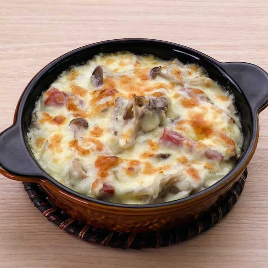 おうちで簡単に作れるグラタンレシピをご紹介!たっぷりのきのことごろごろに切ったブロックベーコンを入れて食べ応え抜群です。寒い日の一品にいかがでしょうか♪【減塩対策対応レシピ】※減塩対策ついてはQ&Aをご参照ください。