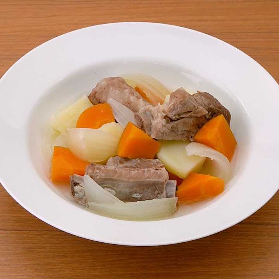 大きめの鍋にスペアリブ、水を入れて中火で熱し、煮立ったらアクを取り除き、ふたをして弱火で20〜30分ほど煮る。玉ねぎ、にんじん、じゃがいも、ローリエ、☆を加えて煮立ったらふたをし、さらに10分ほど煮る。ローリエを取り除く。