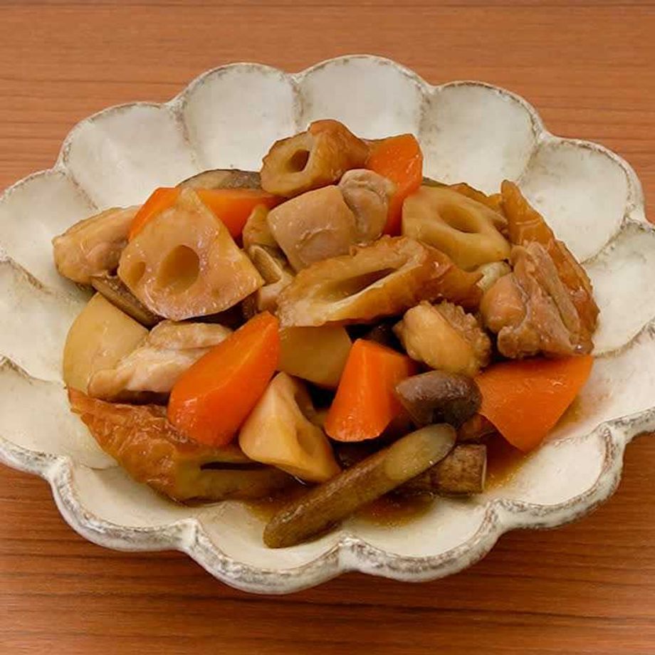 フライパンにサラダ油を入れて中火で熱し、鶏肉を入れて肉の色が変わるまで炒める。にんじん、れんこん、ごぼうを加えて油がなじむまで炒め、しいたけ、ちくわを加えて手早く炒める。☆を加えて煮立ったらふたをして7〜8分ほど煮る。しょうゆを加えて混ぜ、再びふたをして5分ほど煮る。途中煮汁をかけながら煮る。