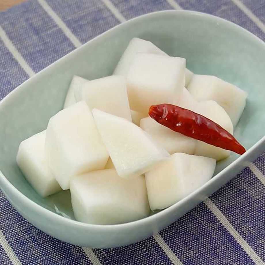 聖護院(しょうごいん)かぶとは大型のかぶで京野菜の一種です。京都の漬物、千枚漬けの材料としても使われており、漬物にするのにぴったりのかぶです。ご家庭でも作りやすく角切りにして甘酢に漬け込みます♪【減塩対策対応レシピ】※減塩対策ついてはQ&Aをご参照ください。