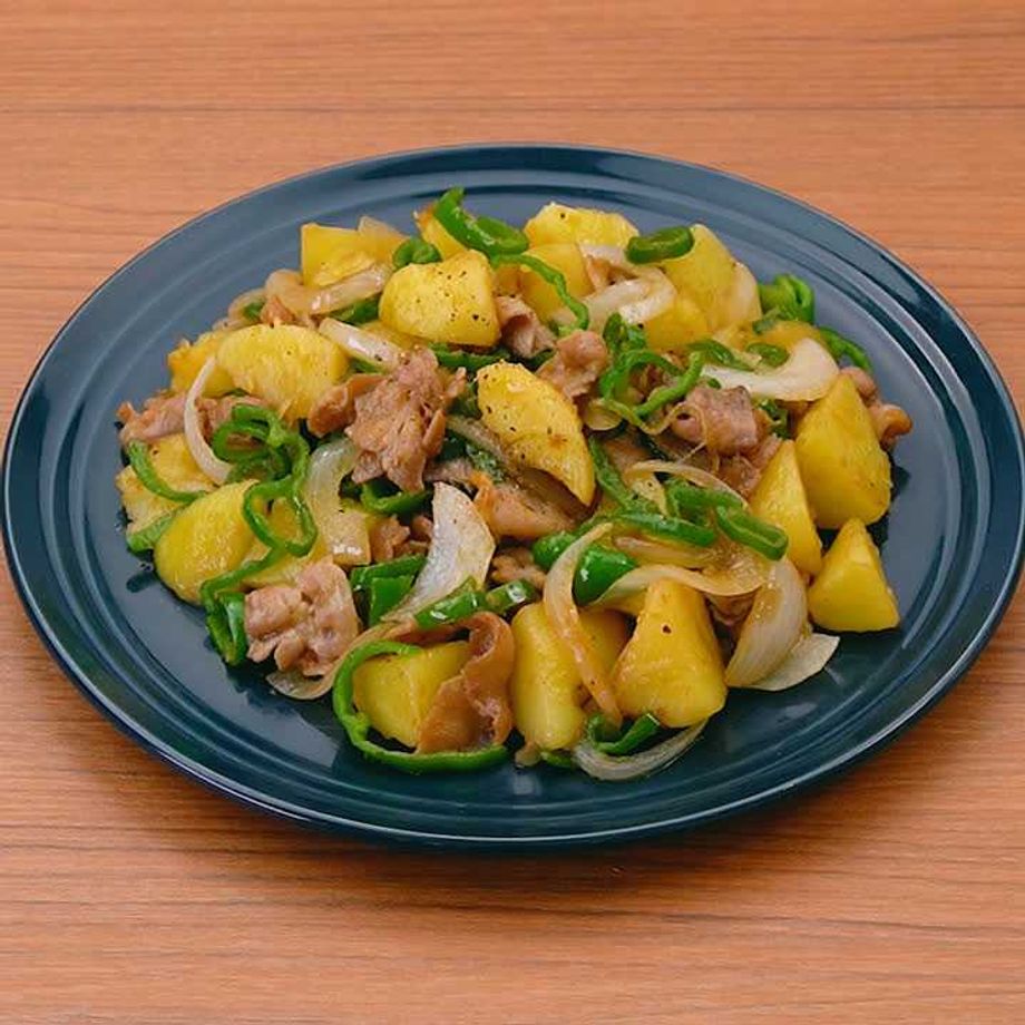 玉ねぎ、じゃがいもを加えてしんなりするまで炒め、ピーマンを加えてさっと炒める。☆を加えて炒め合わせる。