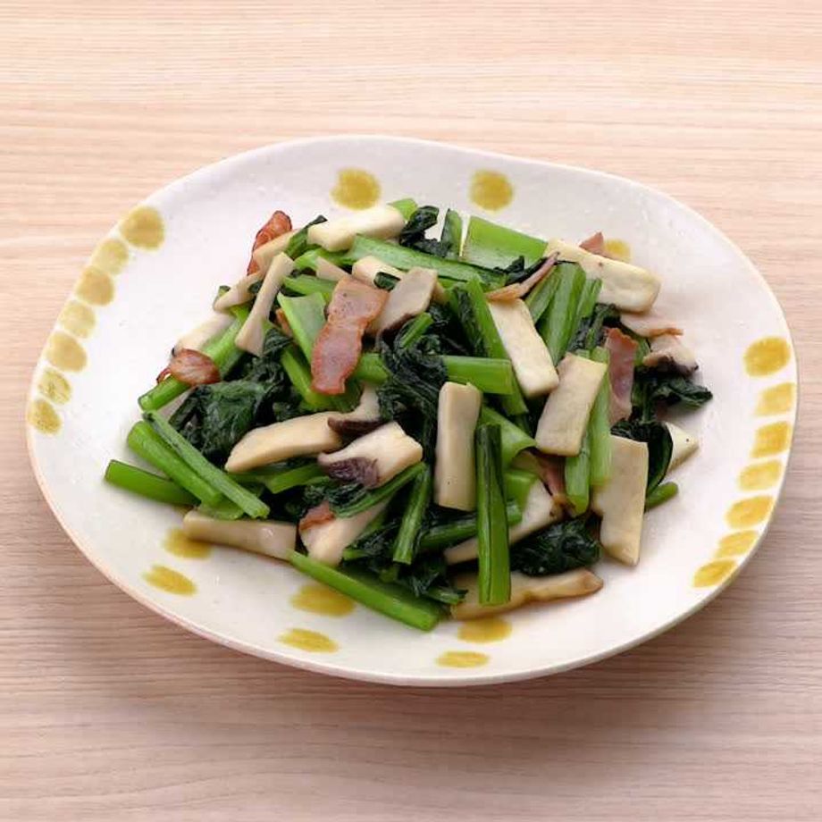 フライパンにサラダ油を入れて中火で熱し、ベーコンを入れて焼き色がつくまで炒める。小松菜、エリンギを加えてしんなりするまで手早く炒める。