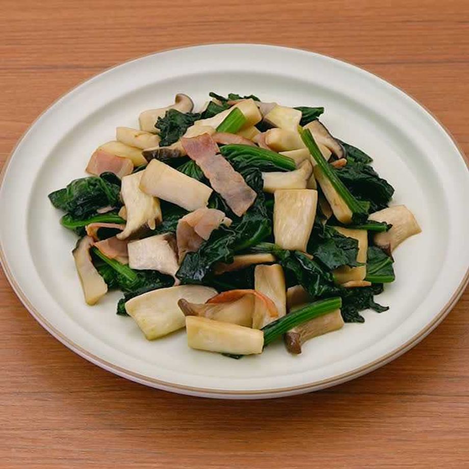 フライパンにサラダ油を入れて中火で熱し、ベーコンを入れて焼き色がつくまで炒める。ほうれん草、エリンギを加えてしんなりするまで手早く炒める。