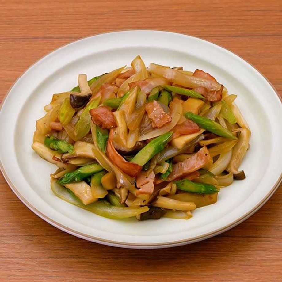 フライパンにサラダ油を入れて中火で熱し、ベーコンを入れて焼き色がつくまで炒める。アスパラ、エリンギ、玉ねぎを加えてしんなりするまで炒める。
